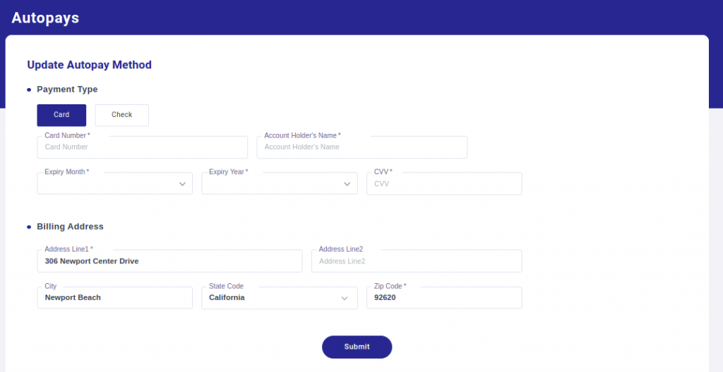 With the assistance of the “Update Autopay Method” button, you can now change the card or ACH details.