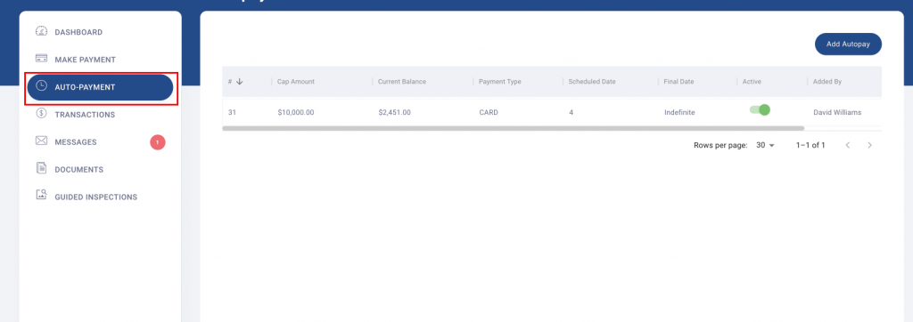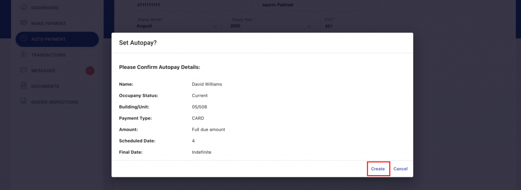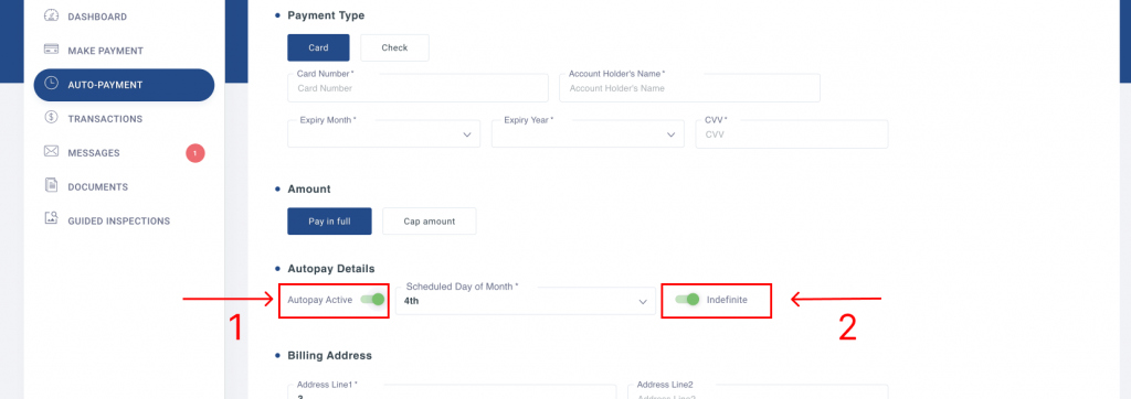 4. Toggle Autopay Active button on to start auto pay and choose the day of the month the payment will be processed. Also, choose to toggle the Indefinite button on to continue auto payments, or turn off to set an end date for auto payments.