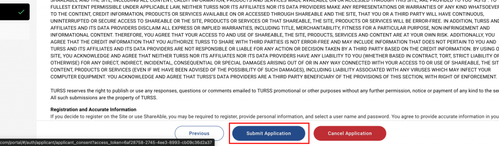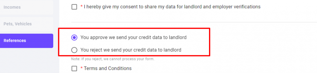 - You must click to approve that your credit data will be sent to the landlord. If you choose to reject it, the form will not process.