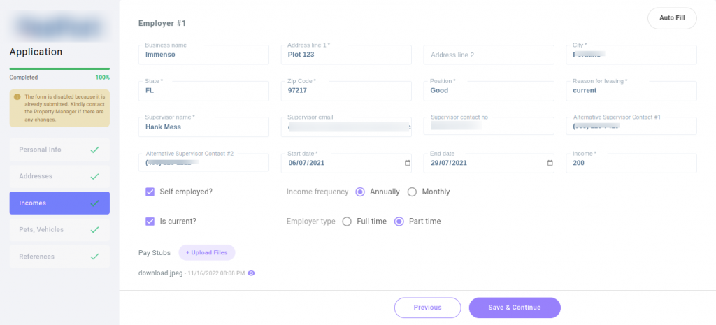 - Fill in all current employer details including business name, address, position, supervisor information, etc.