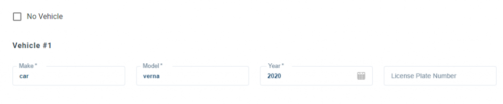 6. Vehicle: Add all vehicles that will be parked on the property by applicants. If there is no vehicles check the No Vehicles box.
