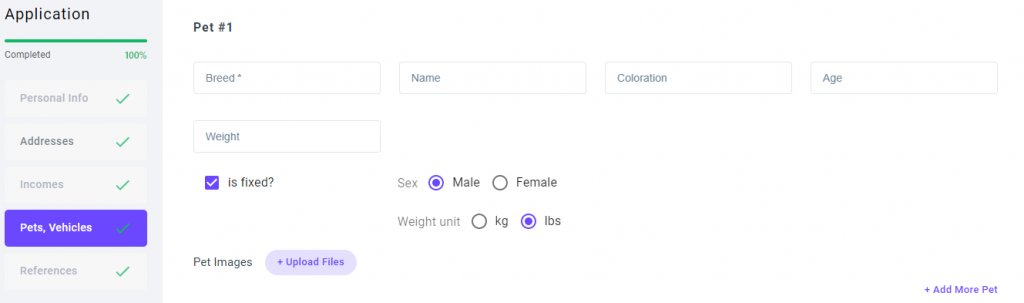5. Pets: This is an optional field, all pets that will be housed within the unit need to be added to this section.